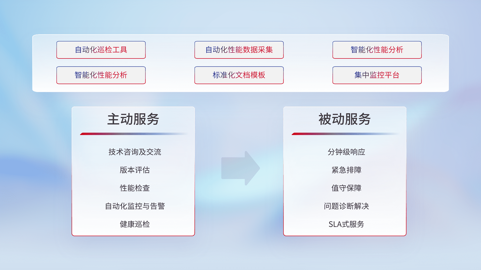 智能化工具和标准化文档,,,保障服务质量,,,提供主动服务(包含技术咨询、、、、版本评估、、、性能检查、、自动化监控与告警、、、健康巡检)和被动服务包含(分钟级响应、、紧急排障、、值守保障、、、问题诊断解决、、、、SLA服务)。。